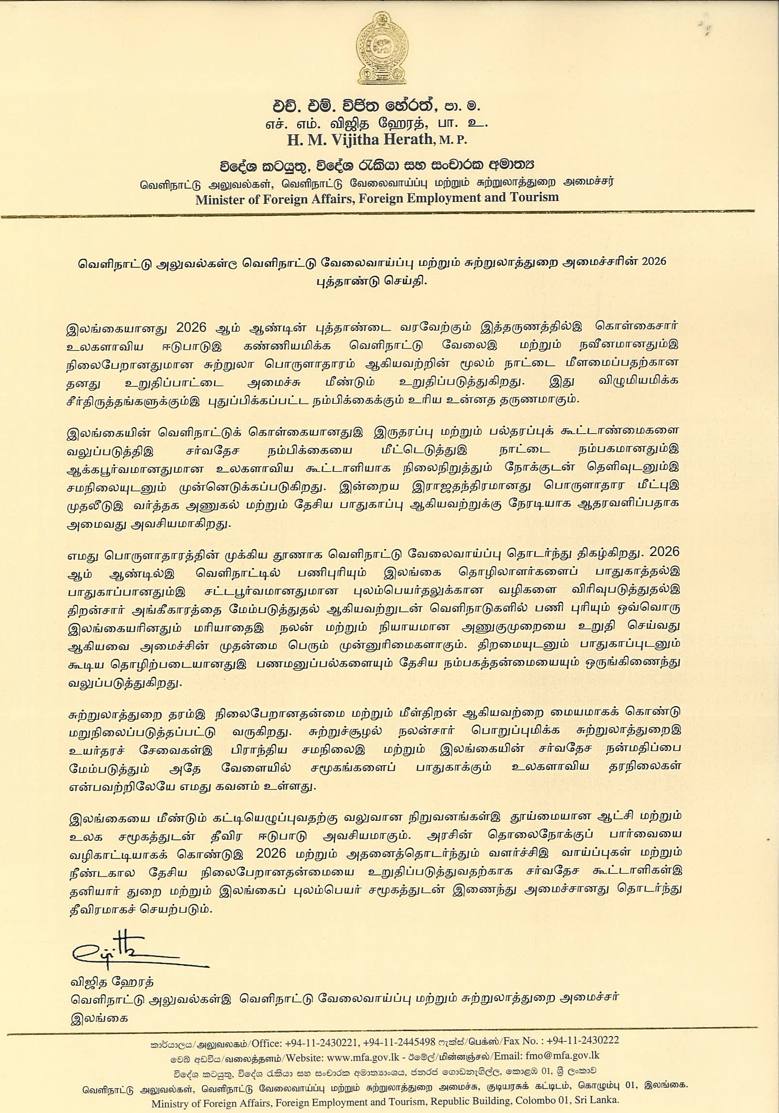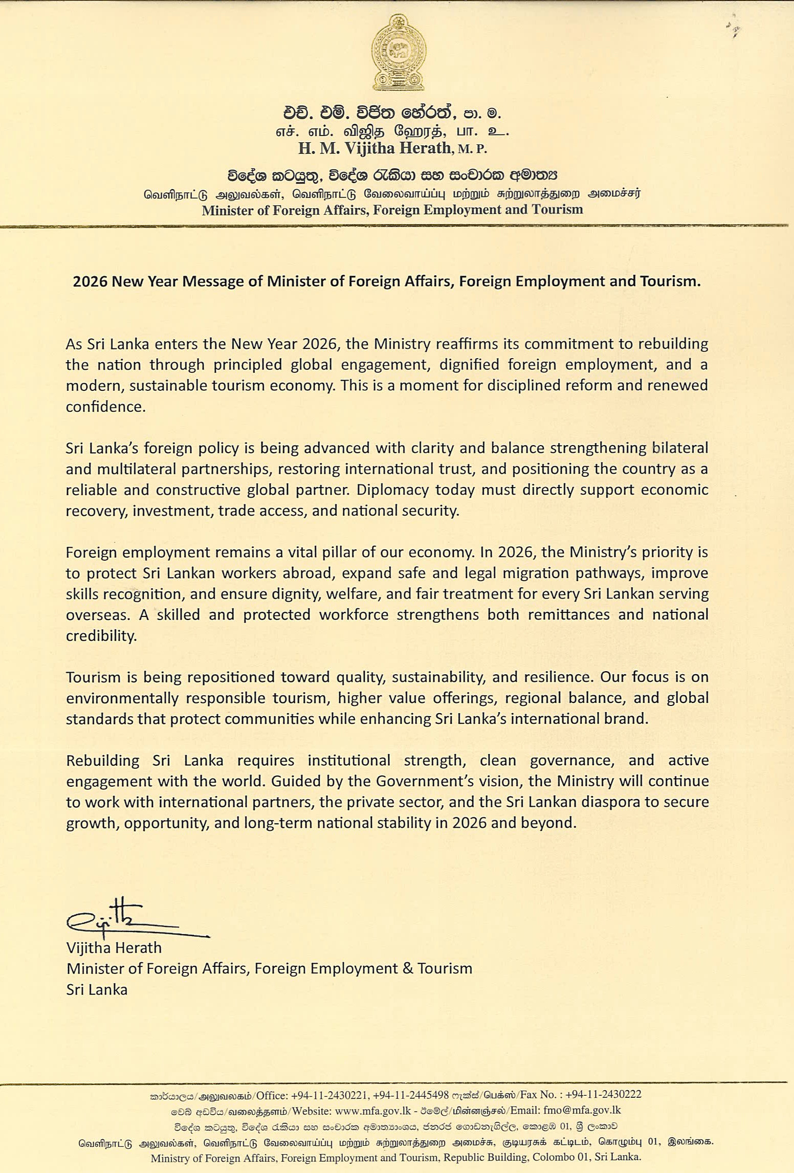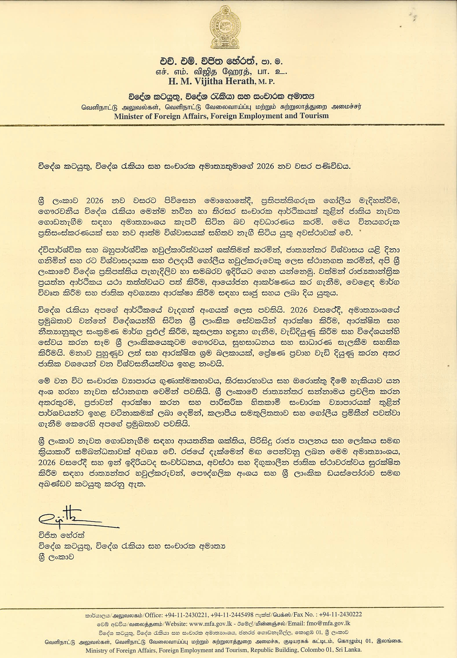 2026 New Year Message of Minister of Foreign Affairs,Foreign Employment and Tourism. By Consulate General of Sri Lanka| 2025-12-31T16:15:26+00:00 December 31st, 2025|Consular Service, Dubai, Economy, Events, Events in Sri Lanka, Gulf Food, News, Press Releases, Special Notice, Sri Lanka|0 Comments Share This Story, Choose Your Platform! FacebookTwitterLinkedinRedditTumblrGoogle+PinterestVkEmail Related Posts On the Occasion of the Sinhala and Tamil New Year ,H.E the President extends his warmest wishes for peace,prosperity,and unity. On the Occasion of the Sinhala and Tamil New Year ,H.E the President extends his warmest wishes for peace,prosperity,and unity. Message from the Hon. Prime Minister on the Occasion of the Sinhala and Tamil New Year Message from the Hon. Prime Minister on the Occasion of the Sinhala and Tamil New Year Message of the Minister of Foreign Affairs, Foreign Employment and Tourism on the occasion of the Sinhala and Tamil New Year Message of the Minister of Foreign Affairs, Foreign Employment and Tourism on the occasion of the Sinhala and Tamil New Year Wishing you a Happy Sinhala and Tamil New Year filled with peace and happiness …! Wishing you a Happy Sinhala and Tamil New Year filled with peace and happiness …! HOLIDAY NOTICE HOLIDAY NOTICE