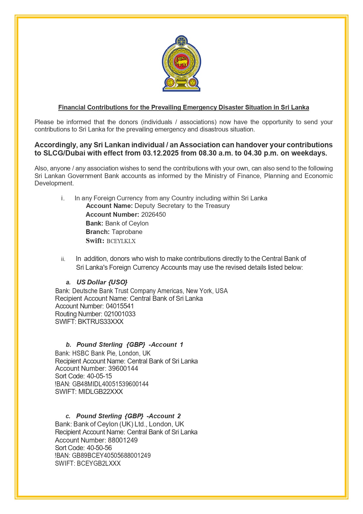 Financial Contributions for the Prevailing Emergency Disaster Situation in Sri Lanka. By Consulate General of Sri Lanka| 2025-11-30T13:51:19+00:00 November 30th, 2025|Consular Service, Dubai, Economy, Events, Events in Sri Lanka, Gulf Food, News, Press Releases, Special Notice, Sri Lanka|0 Comments Share This Story, Choose Your Platform! FacebookTwitterLinkedinRedditTumblrGoogle+PinterestVkEmail Related Posts On the Occasion of the Sinhala and Tamil New Year ,H.E the President extends his warmest wishes for peace,prosperity,and unity. On the Occasion of the Sinhala and Tamil New Year ,H.E the President extends his warmest wishes for peace,prosperity,and unity. Message from the Hon. Prime Minister on the Occasion of the Sinhala and Tamil New Year Message from the Hon. Prime Minister on the Occasion of the Sinhala and Tamil New Year Message of the Minister of Foreign Affairs, Foreign Employment and Tourism on the occasion of the Sinhala and Tamil New Year Message of the Minister of Foreign Affairs, Foreign Employment and Tourism on the occasion of the Sinhala and Tamil New Year Wishing you a Happy Sinhala and Tamil New Year filled with peace and happiness …! Wishing you a Happy Sinhala and Tamil New Year filled with peace and happiness …! HOLIDAY NOTICE HOLIDAY NOTICE