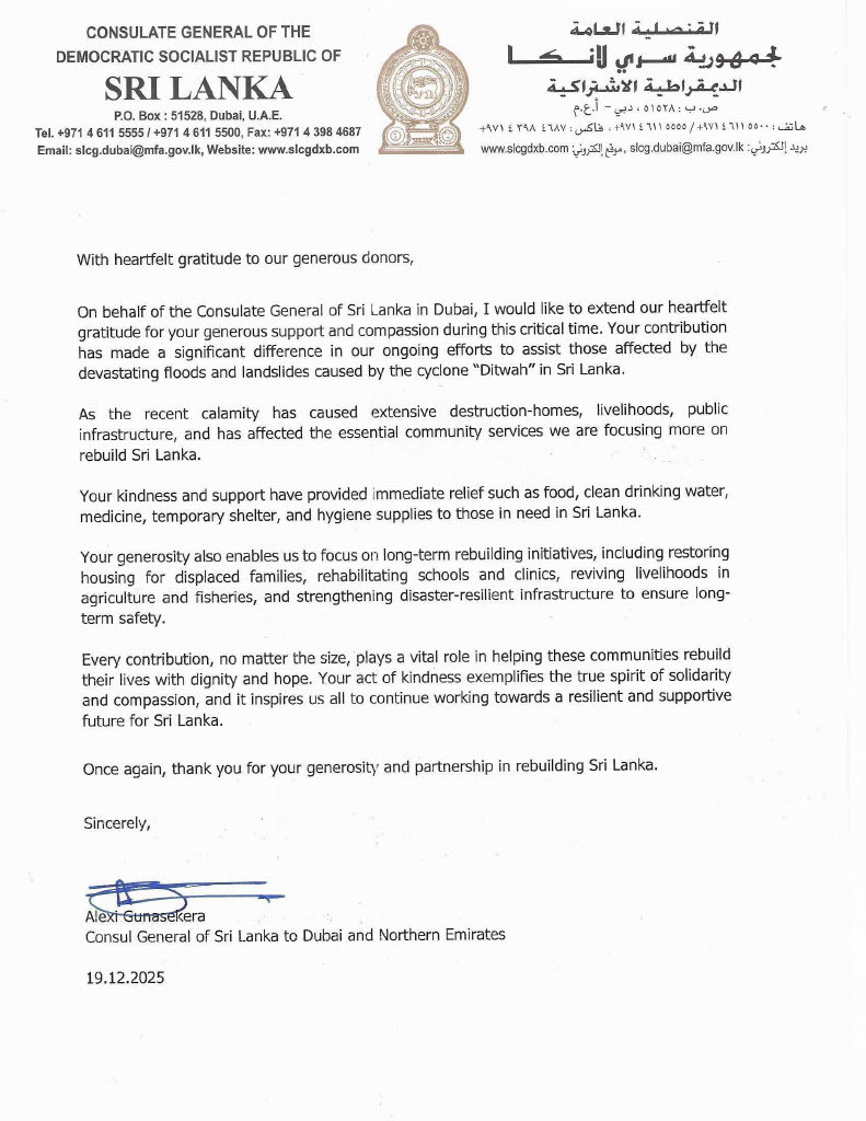 A note of appreciation from Mr. Alexi Gunasekera, Consul General of Sri Lanka to the Northern Emirates. By Consulate General of Sri Lanka| 2025-12-19T09:22:46+00:00 December 19th, 2025|News|0 Comments Share This Story, Choose Your Platform! FacebookTwitterLinkedinRedditTumblrGoogle+PinterestVkEmail Related Posts On the Occasion of the Sinhala and Tamil New Year ,H.E the President extends his warmest wishes for peace,prosperity,and unity. On the Occasion of the Sinhala and Tamil New Year ,H.E the President extends his warmest wishes for peace,prosperity,and unity. Message from the Hon. Prime Minister on the Occasion of the Sinhala and Tamil New Year Message from the Hon. Prime Minister on the Occasion of the Sinhala and Tamil New Year Message of the Minister of Foreign Affairs, Foreign Employment and Tourism on the occasion of the Sinhala and Tamil New Year Message of the Minister of Foreign Affairs, Foreign Employment and Tourism on the occasion of the Sinhala and Tamil New Year Wishing you a Happy Sinhala and Tamil New Year filled with peace and happiness …! Wishing you a Happy Sinhala and Tamil New Year filled with peace and happiness …! HOLIDAY NOTICE HOLIDAY NOTICE