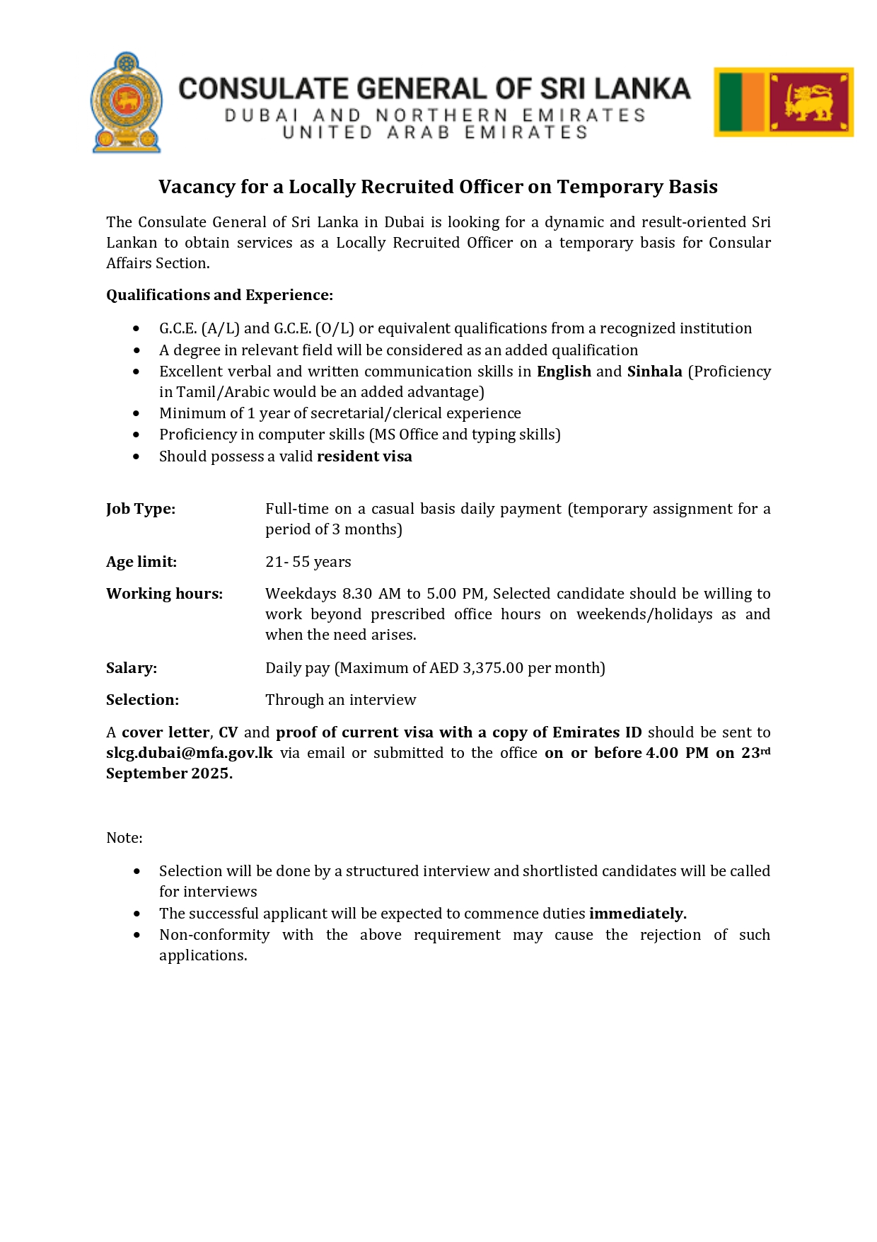 Vacancy Notice By Consulate General of Sri Lanka| 2025-09-09T16:30:34+00:00 September 9th, 2025|Consular Service, Dubai, Economy, Events, Events in Sri Lanka, Gulf Food, News, Press Releases, Special Notice, Sri Lanka|0 Comments Share This Story, Choose Your Platform! FacebookTwitterLinkedinRedditTumblrGoogle+PinterestVkEmail Related Posts On the Occasion of the Sinhala and Tamil New Year ,H.E the President extends his warmest wishes for peace,prosperity,and unity. On the Occasion of the Sinhala and Tamil New Year ,H.E the President extends his warmest wishes for peace,prosperity,and unity. Message from the Hon. Prime Minister on the Occasion of the Sinhala and Tamil New Year Message from the Hon. Prime Minister on the Occasion of the Sinhala and Tamil New Year Message of the Minister of Foreign Affairs, Foreign Employment and Tourism on the occasion of the Sinhala and Tamil New Year Message of the Minister of Foreign Affairs, Foreign Employment and Tourism on the occasion of the Sinhala and Tamil New Year Wishing you a Happy Sinhala and Tamil New Year filled with peace and happiness …! Wishing you a Happy Sinhala and Tamil New Year filled with peace and happiness …! HOLIDAY NOTICE HOLIDAY NOTICE